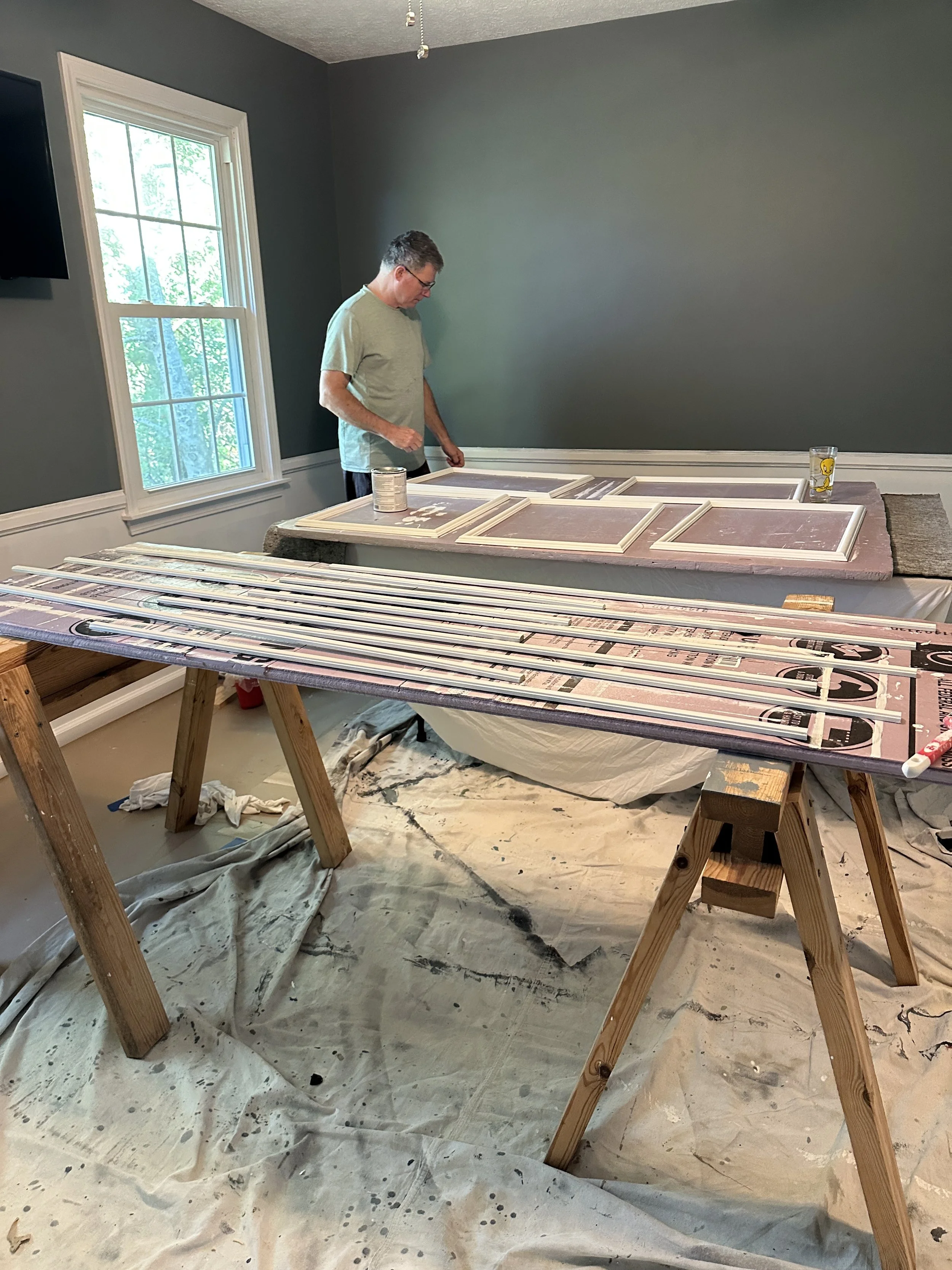 Doug helped me significantly this week with the painting! We were able to work out an assembly line and knock it out in just a few hours. He also added to his genius drying rack set up so we could have a mega drying rack for all of the picture frames so they could dry at the same time. I calculated 26 for this room. We will need to cut a few of them down.
