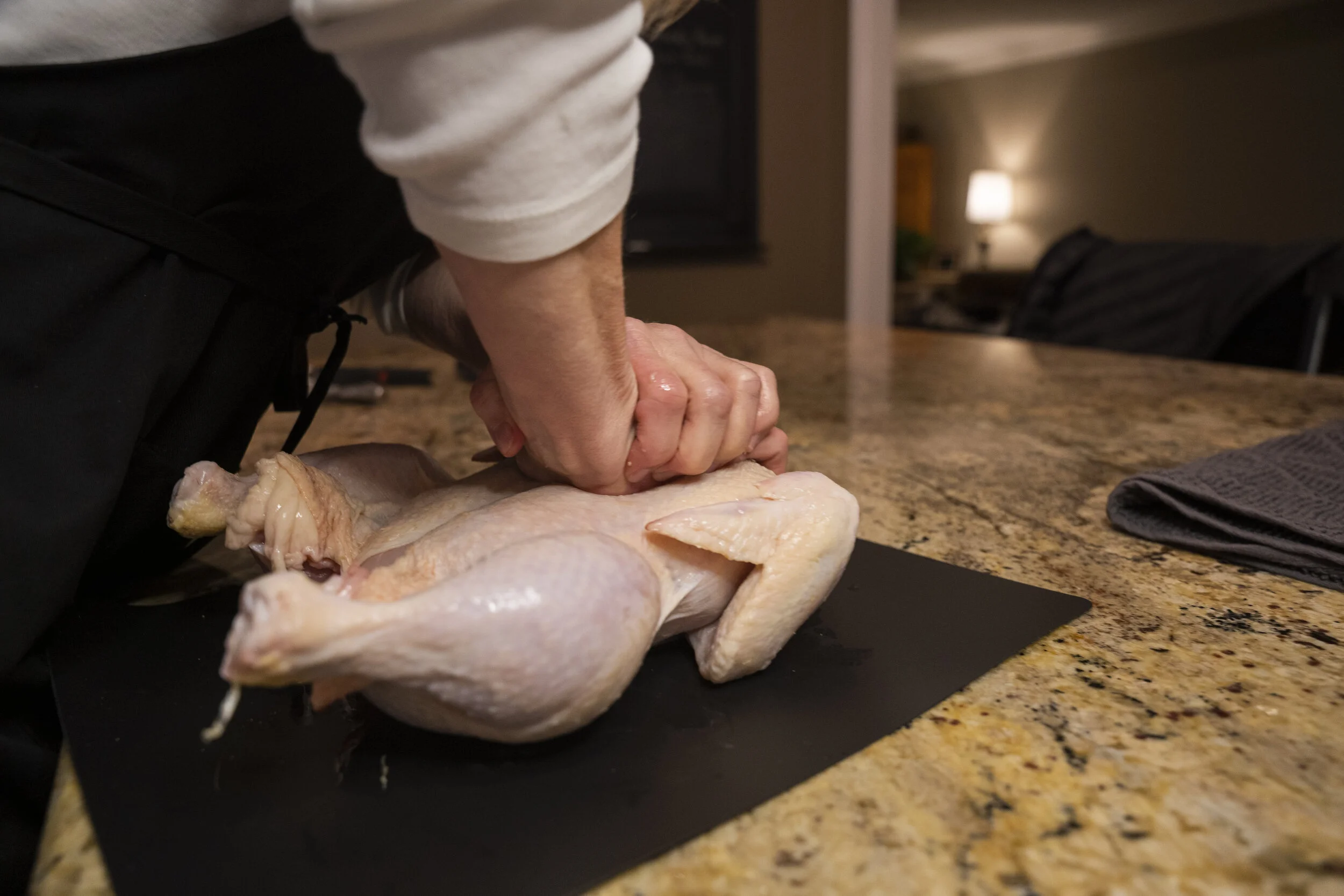 Flip the bird so the breast side is up. Put your hand over the breastbone like you are administering CPR and push down on it until you hear that satisfying snap. Your bird should be lying pretty flat at this point.